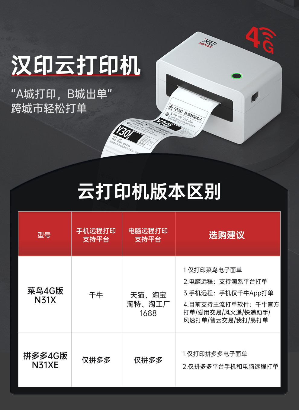【4G云远程菜鸟版】N31X 菜鸟远程云打印机【手机/+远程打单+多人共享】送2年流量
