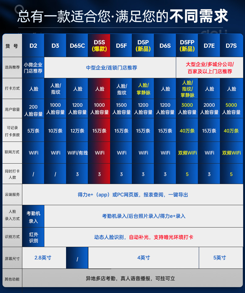 得力D5S人脸识别打卡考勤机智能云多店管理指纹面部识别公司企业员工上下班签到机打卡器D2企业微信一体机D7F