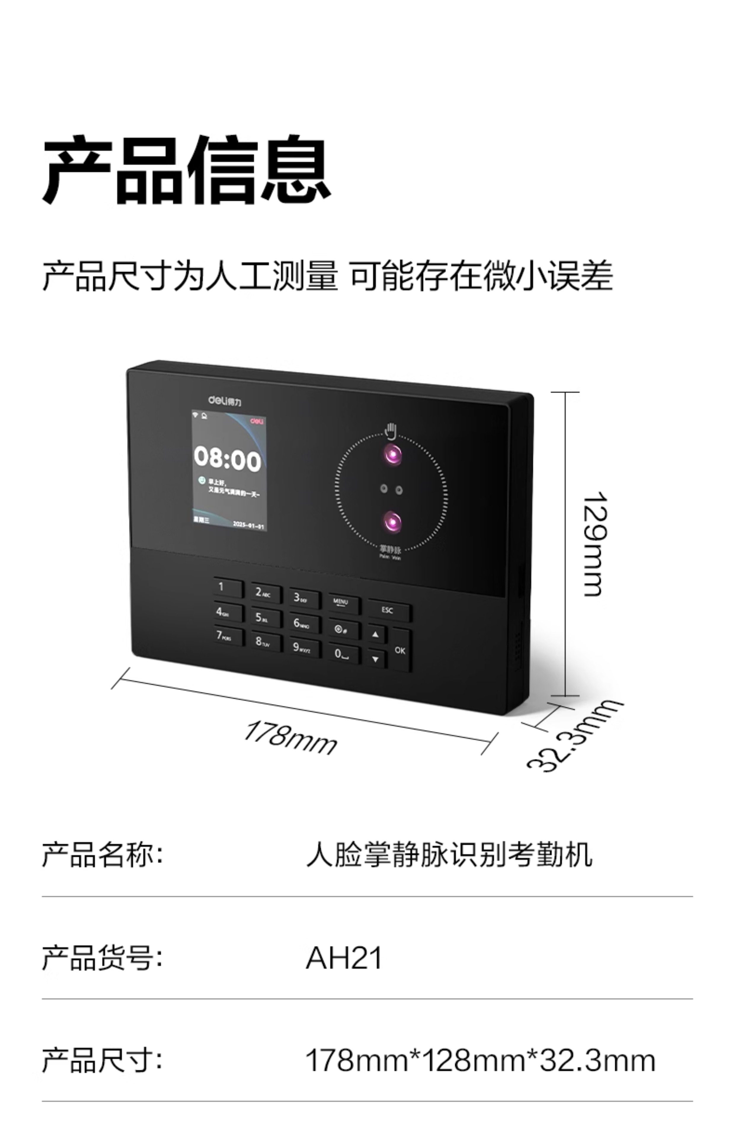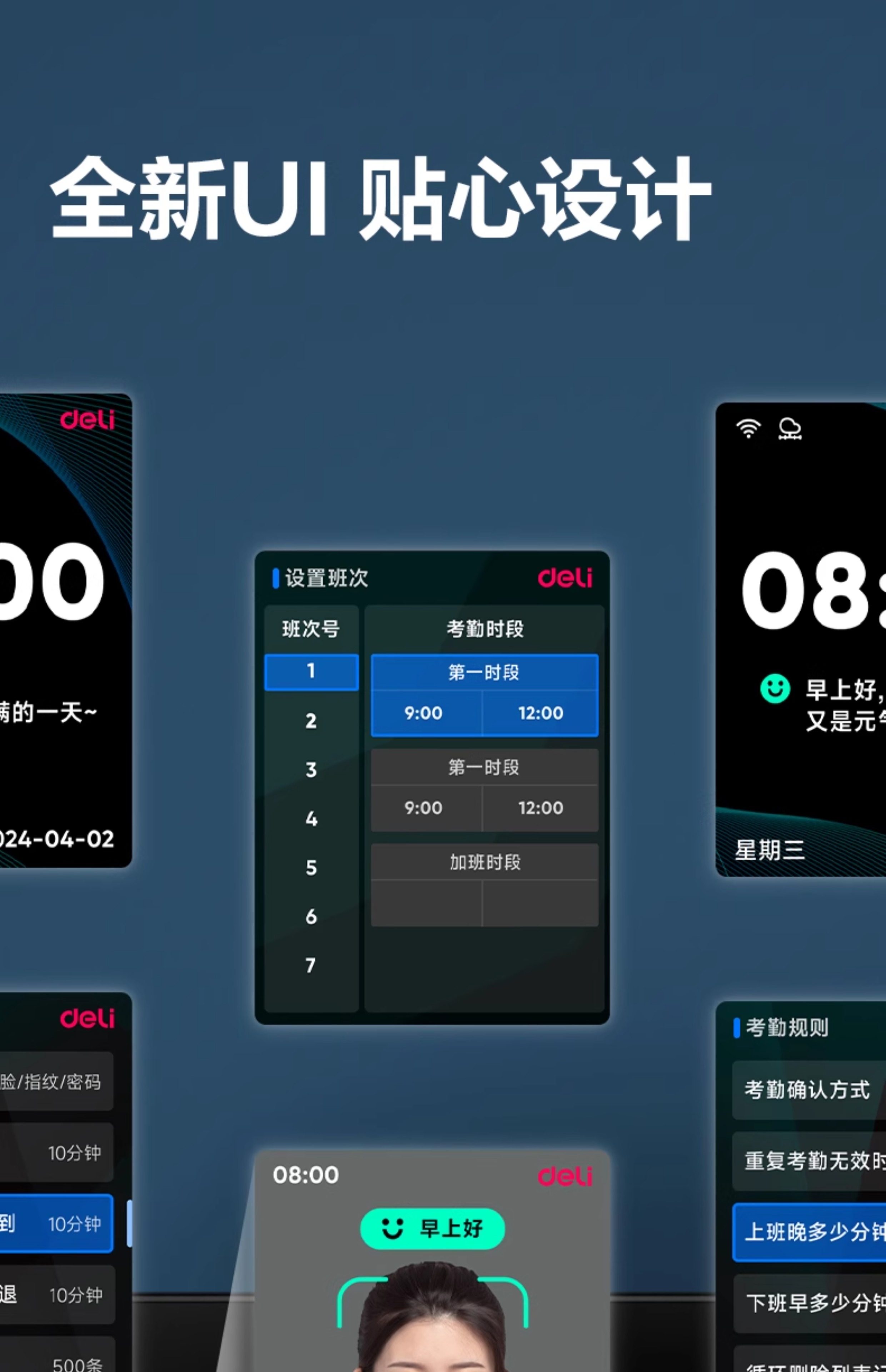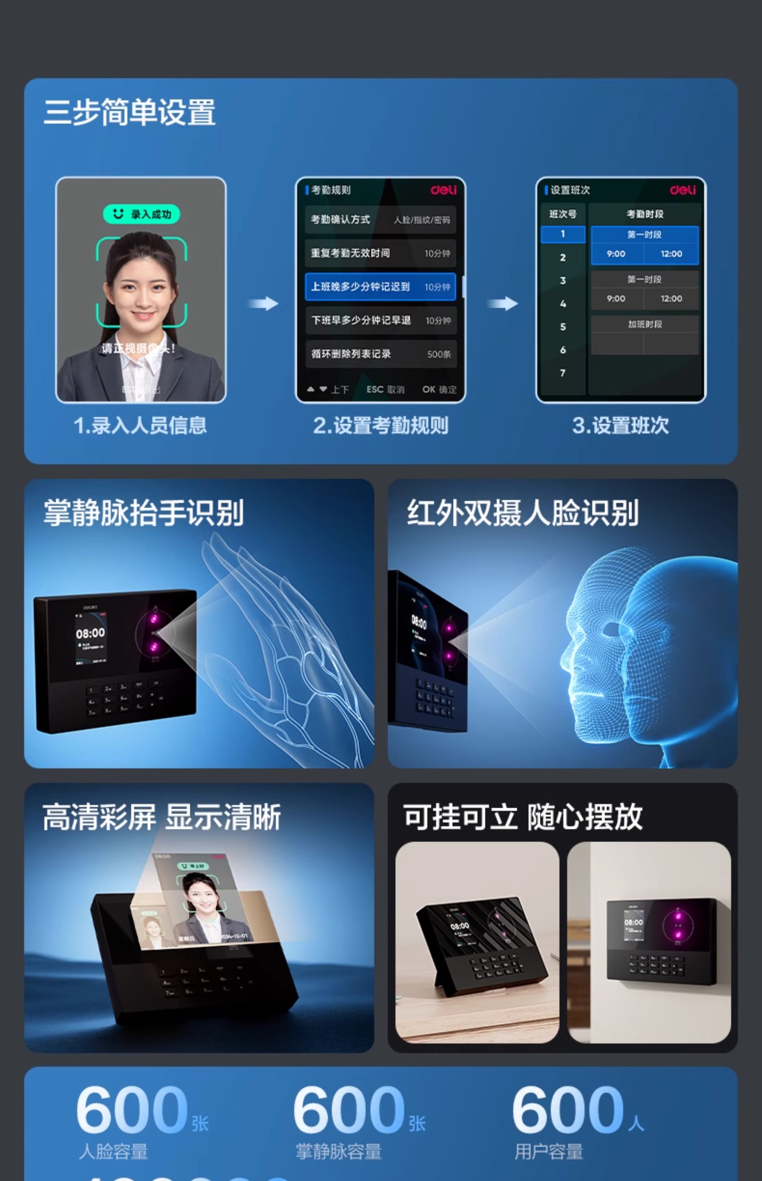 商品名称:得力人脸识别打卡考勤机员工上下班扫脸打卡式记录机工地面部刷脸打卡考勤机2025新品升级更灵敏