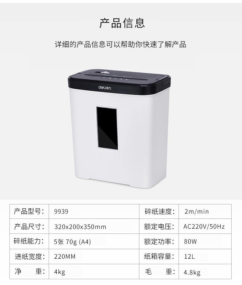 商品名称:得力9939碎纸机家用办公电动小型迷你4级保密家用大功率纸文件