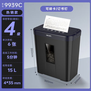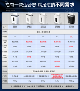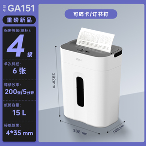 商品名称:得力GA151小型碎纸机办公室自动家用颗粒状电动商用9939桌面纸张文件粉碎机GA390德标5级保密碎带钉文件碎卡