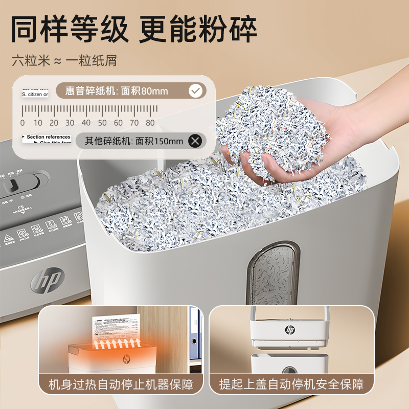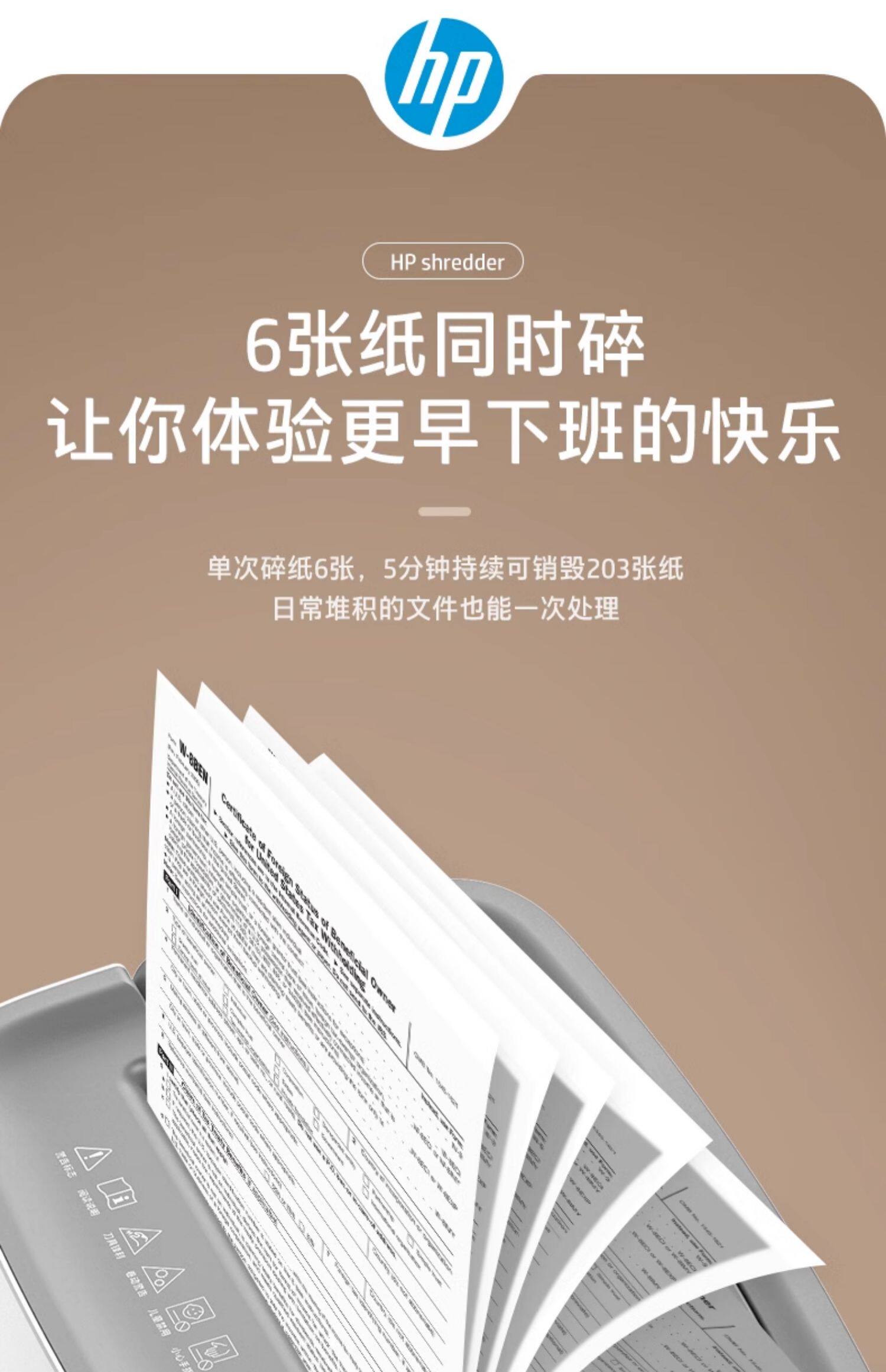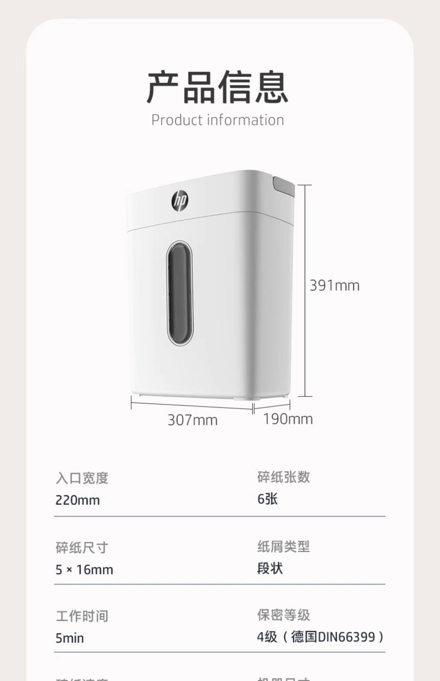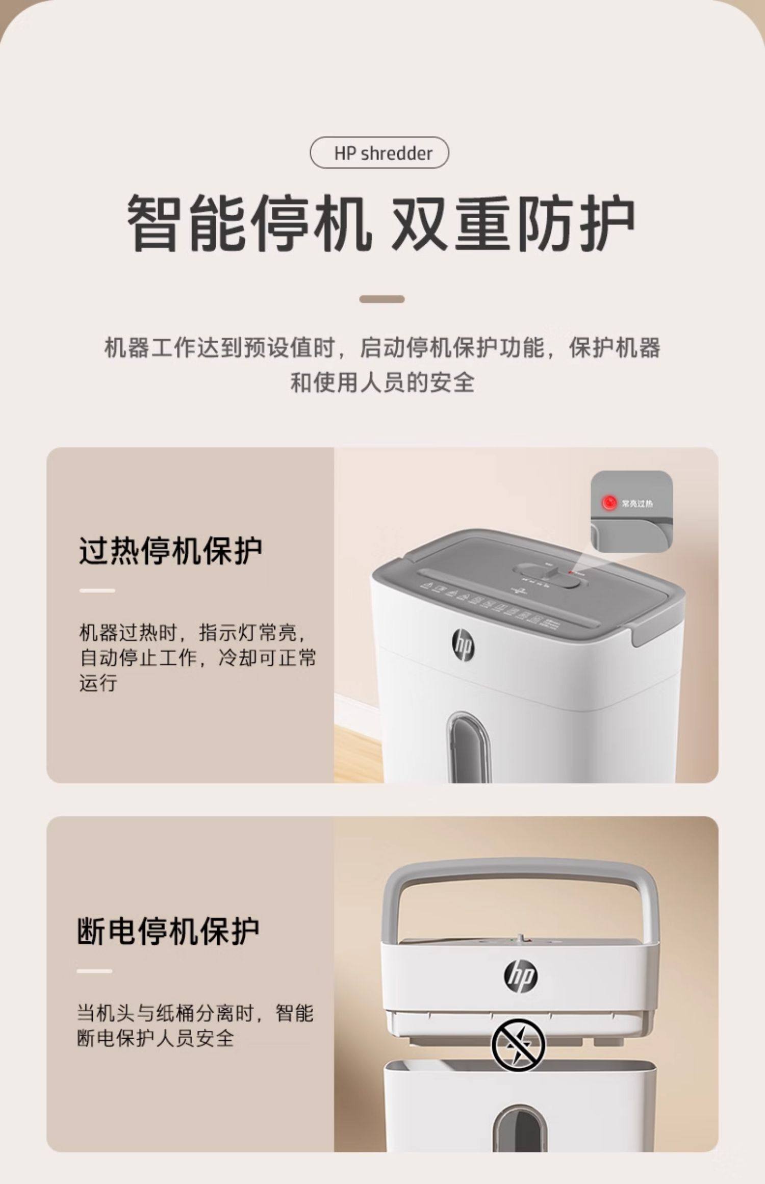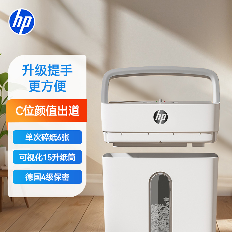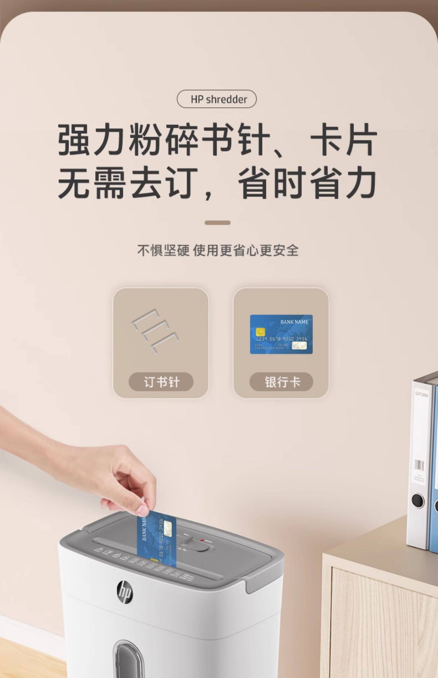 商品名称:惠普碎纸机办公室专用全自动办公家用家庭商用迷你小型粉碎机4级保密桌面纸碎卡光盘胶卷W1506CCW1505CC