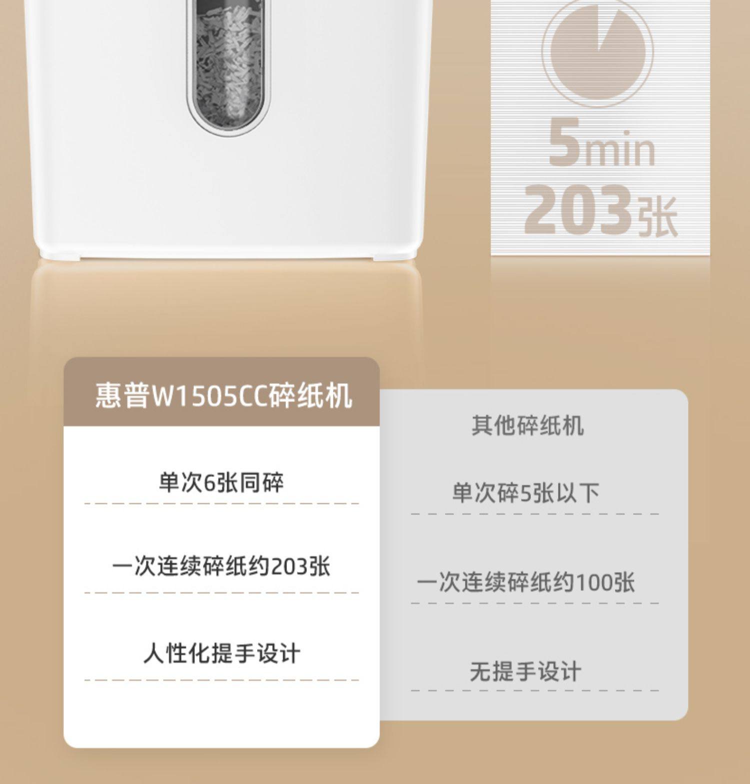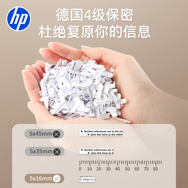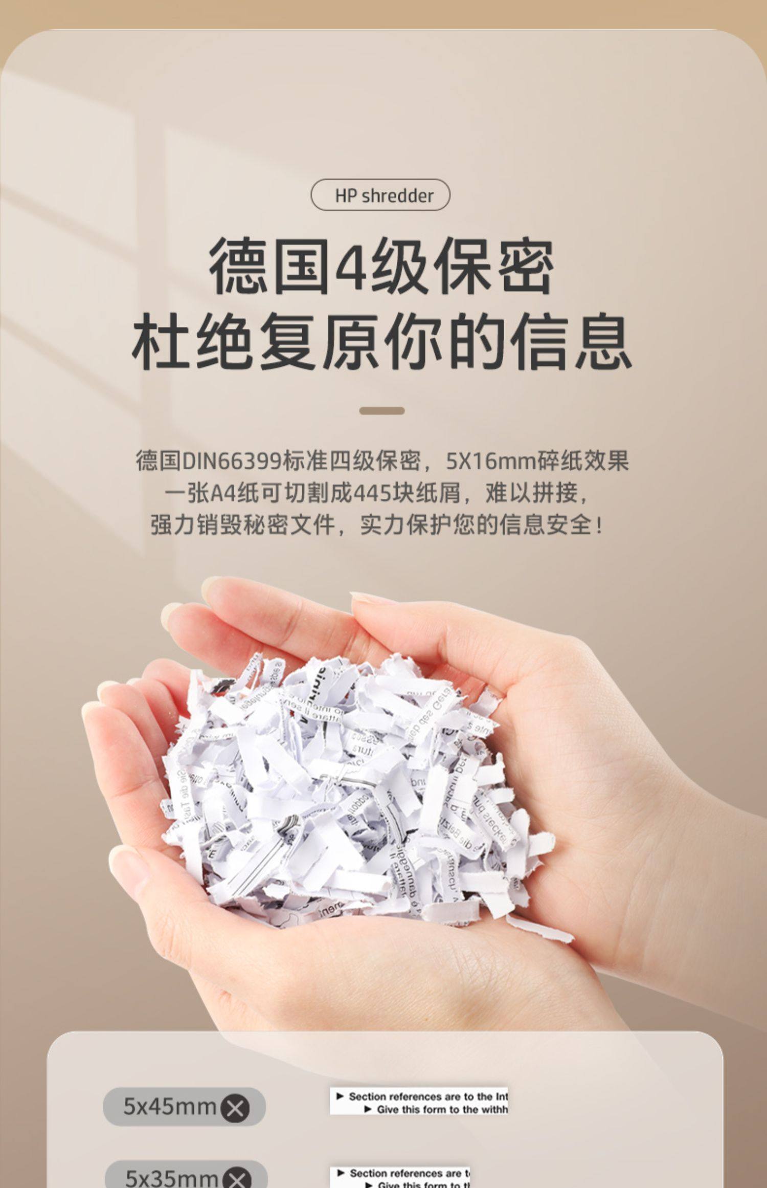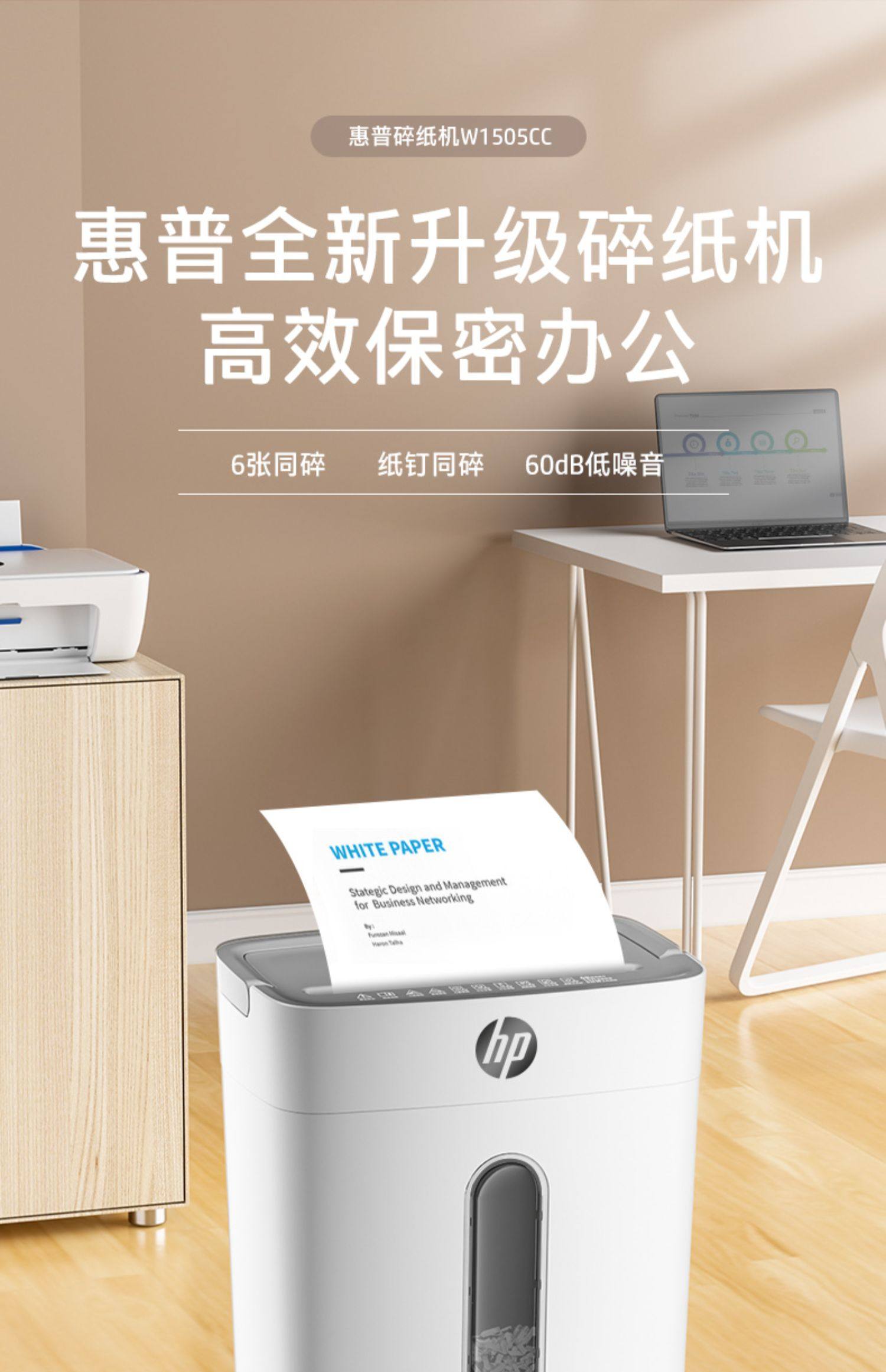 商品名称:惠普碎纸机办公室专用全自动办公家用家庭商用迷你小型粉碎机4级保密桌面纸光盘胶卷W1506CCW1505CC碎卡