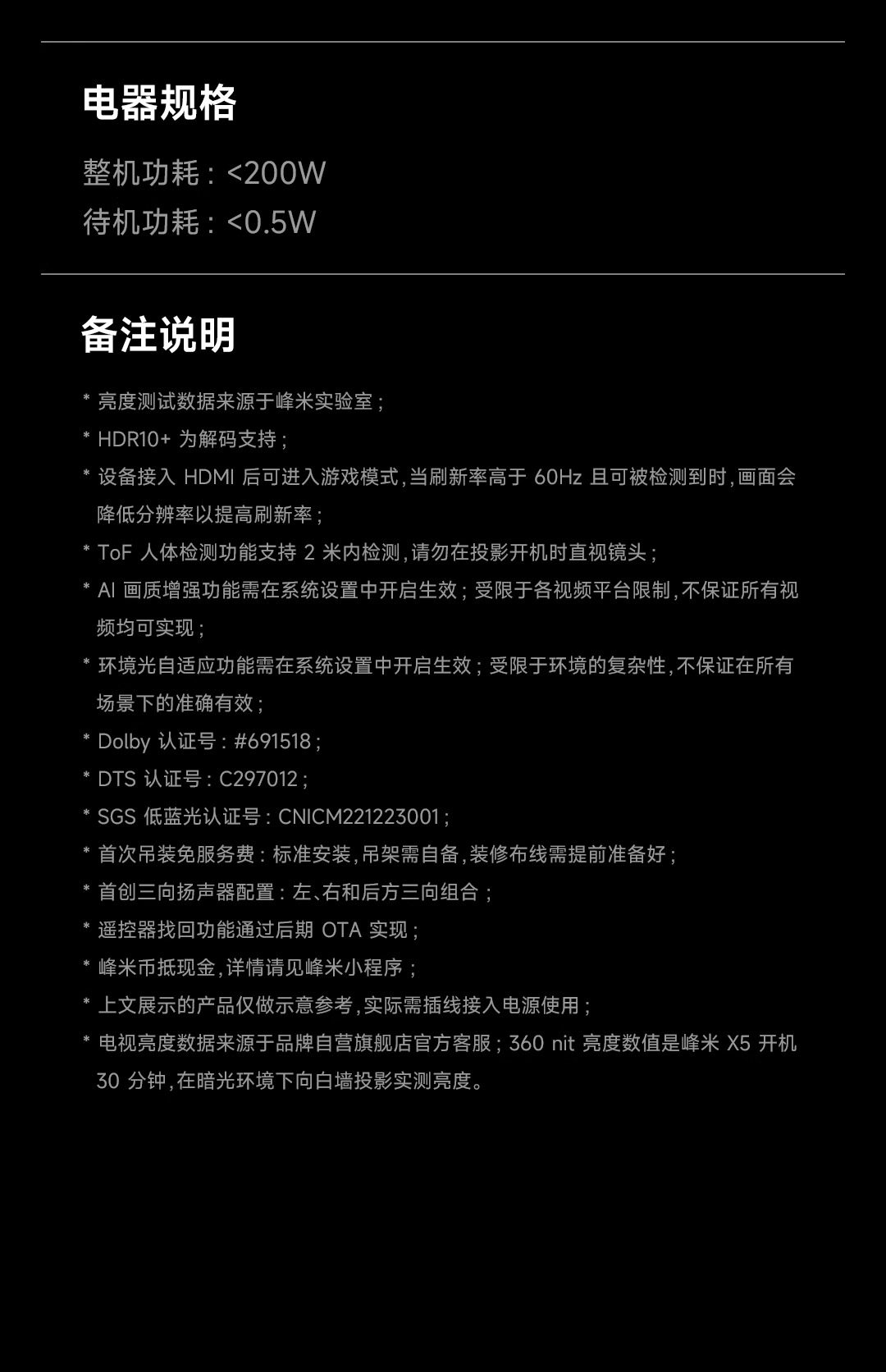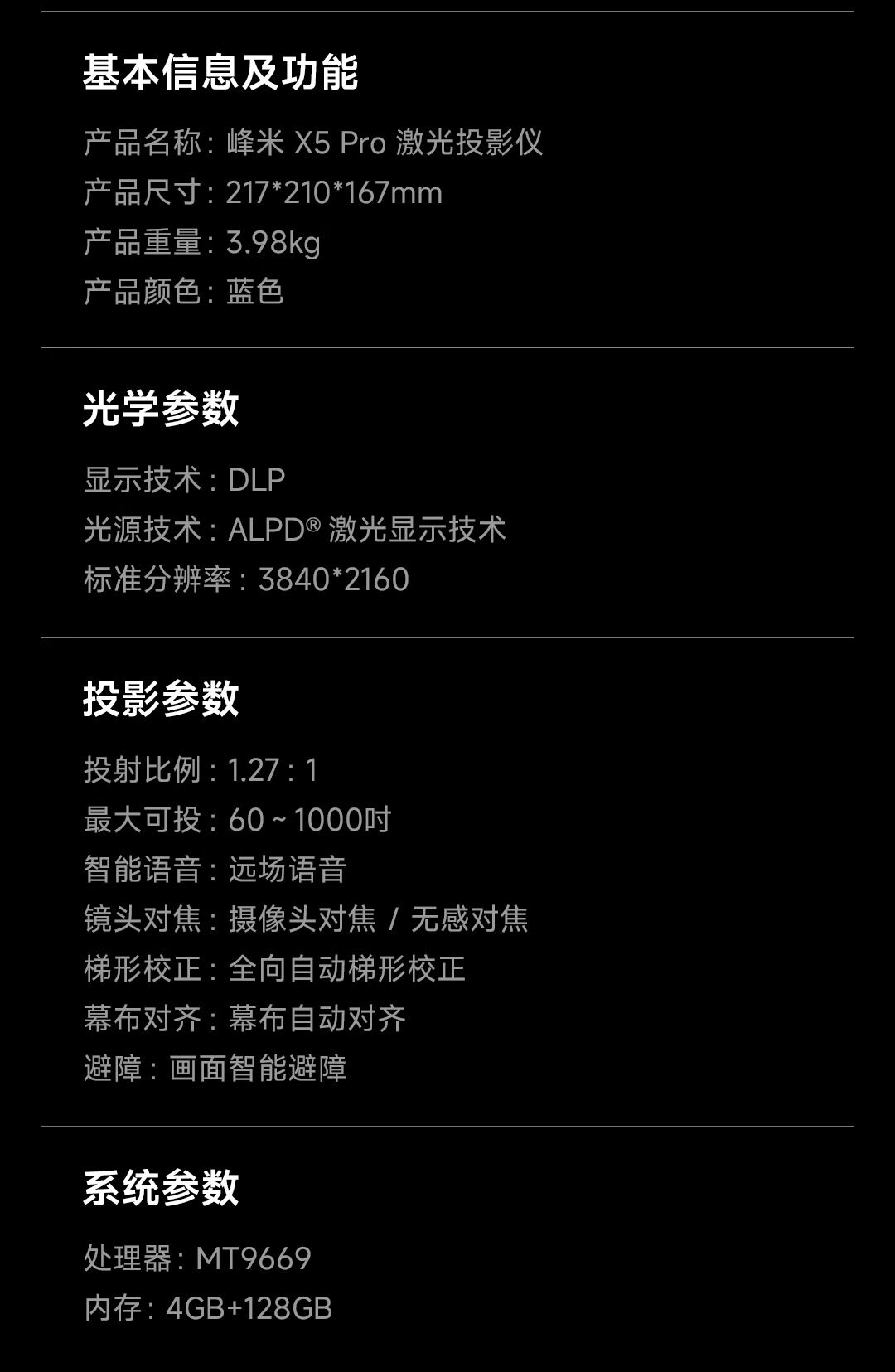 商品名称:峰米X5pro激光投影仪4K家用超高清投影机投墙100寸120家庭影院办公会议海外版全球国际150