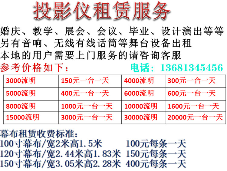 商品名称:投影机租赁北京天津投影仪出租高清1080P幕布会展会议婚庆影棚拍