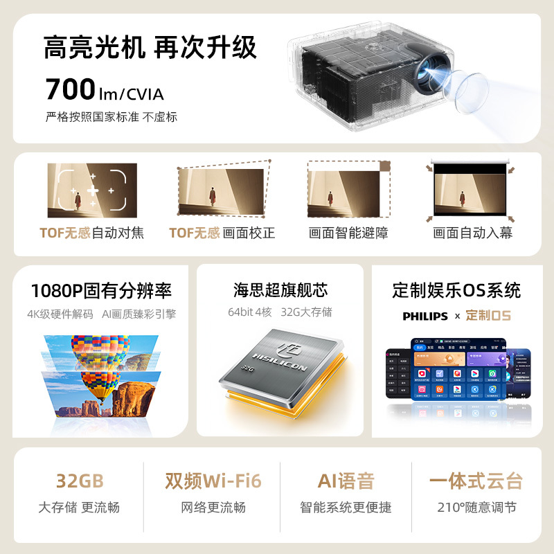 商品名称:Philips/飞利浦25新款投影仪家用超高清家庭影院卧室客厅1080p会议手机投屏激光投影机小型配菲涅尔硬屏幕布